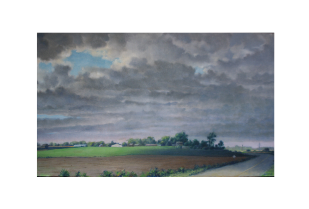 In this large painting, there is a meticulously rendered field in the foreground that, in a blast of sun, unexpectedly grows dreamy and smooth as the eye travels back toward the horizon. A long, subtle curve of hedge, dotted with autumnal color, wends sinuously across the canvas and behind it, while a procession of farm buildings in clear light structures the composition. The sky is grayish-white toward the horizon but gains in blue as it rises, where a singular scrap of cumulus cloud floats in a sea of color. The sheer painterliness of that cloud is exhilarating. Carpentier is known for his big, gorgeous skies and that evocative cloud is part of it.